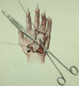 Sketch by Mollie Lentaigne of hand surgery, 1940s © East Grinstead Museum, reproduced with their kind permission.