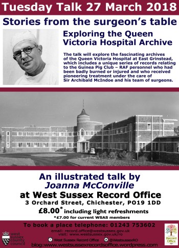On 27th March 2018, I will be delivering ‘Stories from the Surgeon’s table – Exploring the Queen Victoria Hospital archive’ as part of our regular series of ‘Talks on Tuesdays’ at WSRO. This will be a chance to hear the story of Queen Victoria Hospital with a specific emphasis on the ways in which this is revealed through the documents in the archive, illustrated with plenty of slides. There will be the opportunity to ask questions and to peruse a selection of original documents.