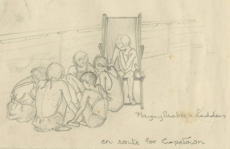 Miss Stromwall compiled four ‘scrapbooks’ of the time in South Africa. She made pencil drawings and watercolours of the children, and took photographs of them. There is an extensive typescript account, which appears to have been taken from letters she sent back to England. There are also programmes of events on board ship and on land, newspaper cuttings, a plan of ‘West Preston Manor, Rondebosch’, and pressed flowers.