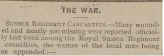 Sussex Regiment Casualties – Many wounded and nearly 300 missing were reported officially last week among the Royal Sussex Regiment…..