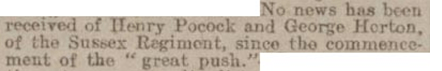On 26 October 1916 the South of England Advertiser, under the heading Angmering, states that no news has been received of Henry Pocock and George Horton of the Sussex Regiment since the commencement of the “great push” whilst on the 1 November the West Sussex Recorder reports: news is anxiously awaited of G Horton and H Pocock.