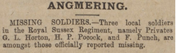When the Worthing Gazette was published on Wednesday August 16th 1916 right at the bottom of page 7 was a four line notice under the heading Angmering – Missing Soldiers. Three names are given Privates G L Horton, H P Pocock and F Punch.