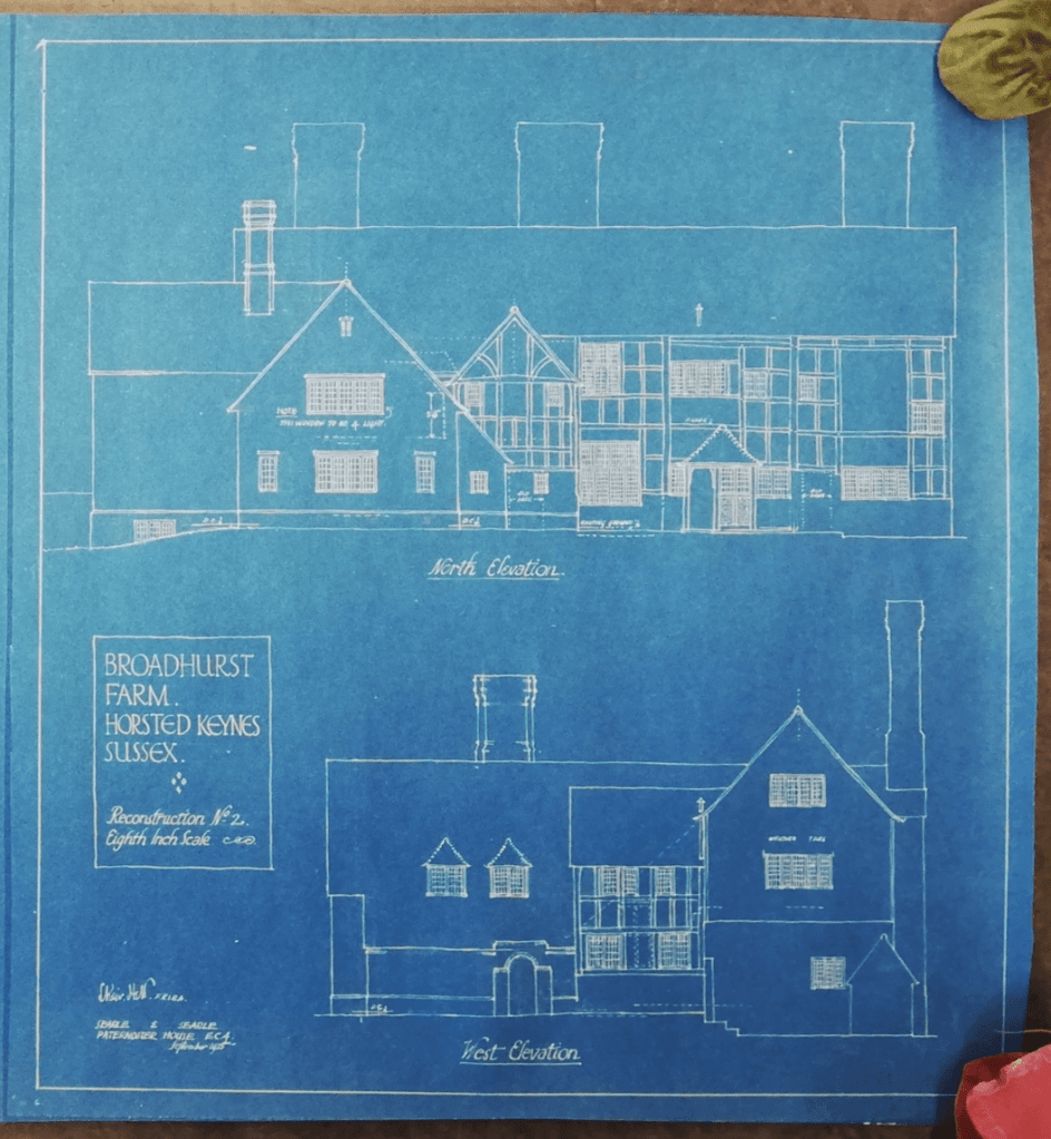 A prolific architect in the early 20th century in Mid Sussex was Leonard Kier Hett (1887-1978), described in the revised Pevsner as sometimes ‘cautiously progressive’ in style. His working papers have recently been deposited at WSRO (AM 818). Much of Hett’s work involved the restoration and enlargement of 16th- and 17th-century houses, for instance Broadhurst Manor in Horsted Keynes.