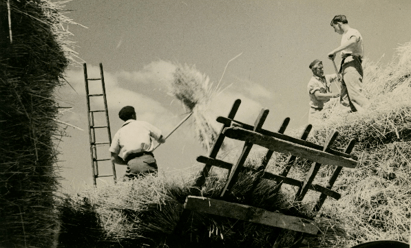 “September 22nd, Monday, 1941 – Very foggy until about 10 o/c & then very hot & lovely. We unloaded the barley & then got the rest from the plain. In the afternoon I had a new & enjoyable job – horseraking. Had to horserake into windrows until milking time, which lasted until about 6.30 as only Renee & I were present. We worked after tea, the others loading while I raked up the rakings until it was too dark to see. The two “Lancashire Lassies” arrived. Margaret Munro is one & the other’s called Gertrude.”