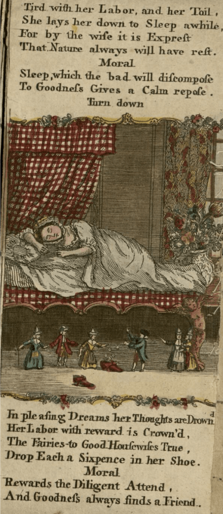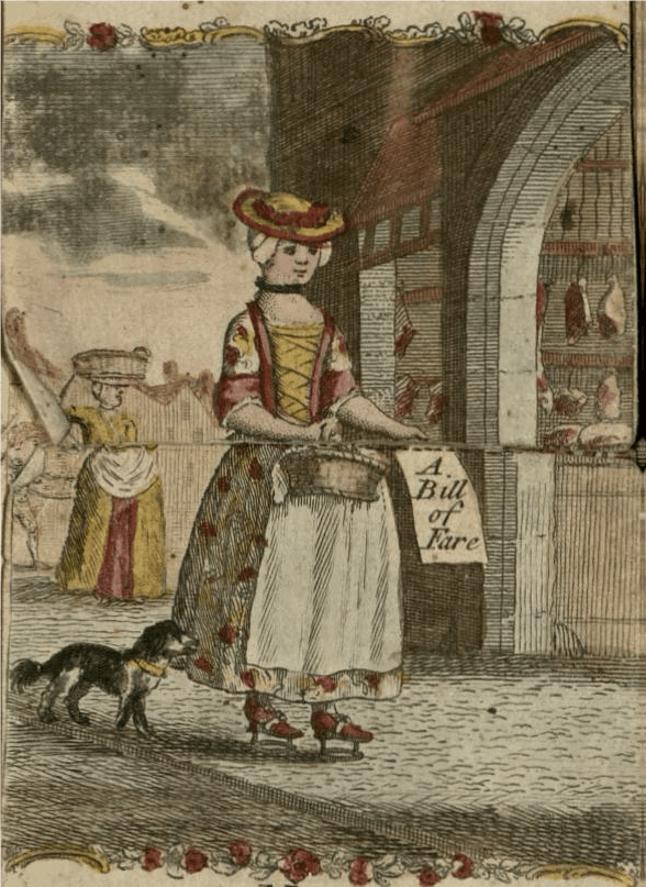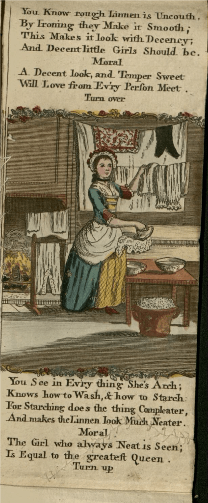 As well as extolling the virtues of being a good housewife and asking questions about 18th Century society – the images used give an idea of the kind of dress Women would have worn, during the 1770’s. Take notice of the shoes on the first page. Here we see that the housewife is wearing a Clog or Pattern which would have protected the shoe from any unpaved muddy streets. Equally her style of dress is either the Polonaise style which features a shorter hemline and drawn-up over-dress or the simpler Robe a la’ Anglaise, consisting of a fitted bodice cut in one piece with an overskirt that was often parted in front to reveal the petticoat.