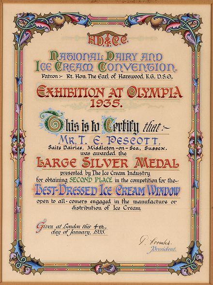 This certificate was awarded to Mr T. E. Pescott of Straits Diary, Middleton-on-Sea, for the ‘Best Dressed Ice Cream Window’ in January 1935. Yes, we know, January is an incongruous time of year for such a convention. Nevertheless, his window display must’ve looked tempting and delicious enough to win such an accolade! We can only imagine the taste of award-winning ice cream….