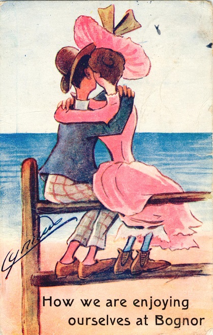 Byelaws under the Public Health Act of 1875 forbade adult men and women to bath together. However, these rules were relaxed in Bognor in 1898, allowing everyone to go into the sea at once. As one of the first beaches to do so, this made the town a very popular destination for holidaying families, and a good topic for humorous postcards!