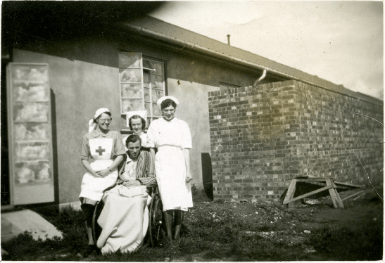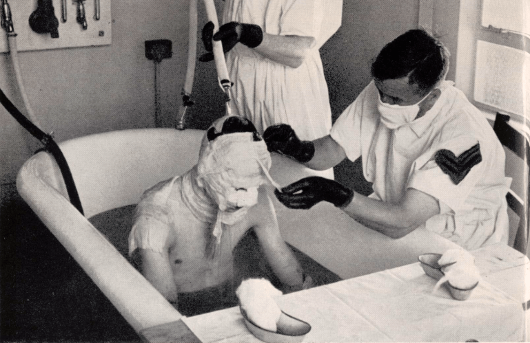 “nurses prepared to face the noxious smells of burned flesh… Nurses [were] capable and willing to spend nights on duty engaged in threading fine surgical needles, repairing punctures in rubber gloves, cutting up gauze to pack sterilising drums with dressing materials, all in a restricted space normally provided with large windows, now blacked out and protected from blast; thus an atmosphere of poor ventilation; and all this beneath skies full of dog-fighting aircraft.” – Extract from Treatment of Burns by Mr Tom Cochrane, former QVH plastic surgeon.