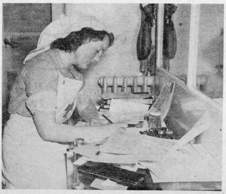 Photograph of VAD nurse, Molly Lentaigne, at work around 1941-1945. Having met McIndoe at a party and impressed him with her artistic skill, he saw in her a budding medical artist and asked her to work with him at QVH. Molly duly joined the VAD and underwent her nursing training, shortly after which she began assisting McIndoe permanently until the end of the war.