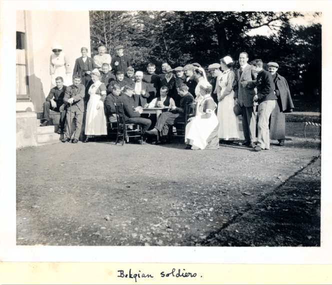 A page from Evelyn’s autograph book showing a photograph of nurses and Belgian soldiers in Bignor Park garden, Add Mss 45230