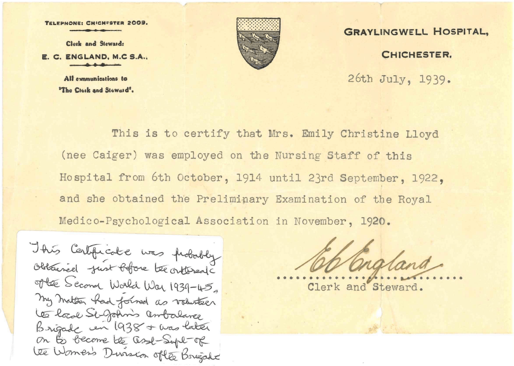 Emily left nursing after her marriage, but when WWII came around she joined the Chichester women’s division of St John’s Ambulance service.