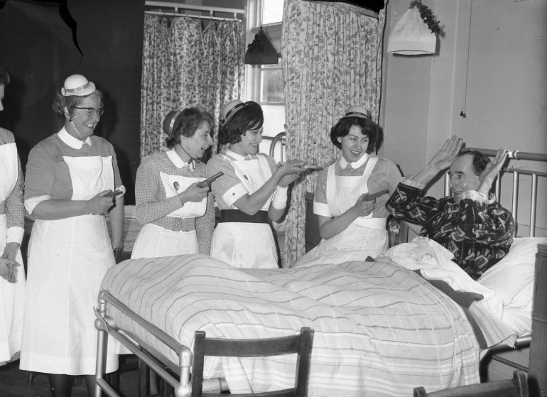 Harry Secombe, member of The Goon Show, visiting nurses at Haywards Heath Hospital c1960.