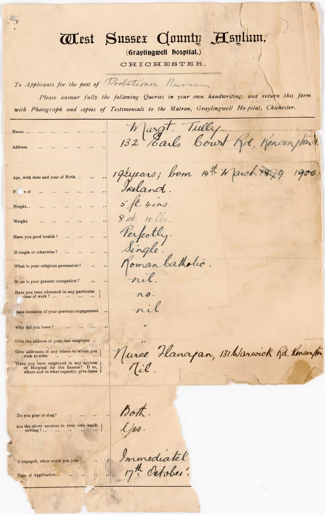 Margaret Tully, originally from Ireland, (pictured below) was one of thousands of young women whose first foray into the world of work was as a psychiatric nurse. She applied to Graylingwell in 1919, at a time when the hospital was just returning to its usual practice of mental health treatment, and hers is just one of six applications to have survived. Margaret may not have been aware of the especially challenging nature of nursing in an asylum environment as she left only a month later. It was, indeed, a career that required an unusual amount of skill, patience, and understanding.