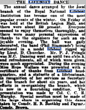 Article from the West Sussex Gazette from 4th January 1934 recounting the annual Lifeboat Dance in Littlehampton, in support of the RNLI. The band played from inside a model lifeboat. The Littlehampton RNLI’s secretary, Miss Hope Wallace, was awarded a statuette of a lifeboatman for her continuing service.