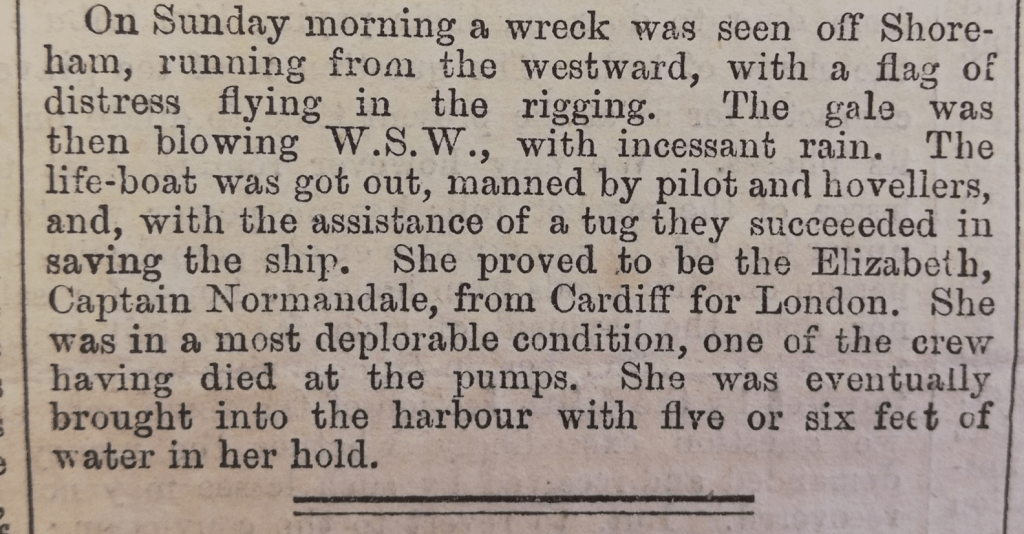 West Sussex Gazette, 2nd October 1856, reports on a shipwreck, the ‘Elizabeth’, off the coast of Shoreham. One of her crew had died. The local lifeboat crew, alongside a tug boat, brought her into the harbour through gales and “incessant rain”.