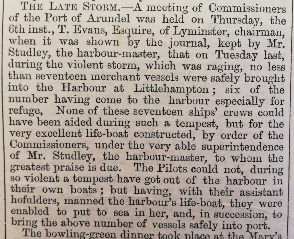 A news article in the West Sussex Gazette, from 15th October 1853, reports on a violent storm which was preventing seventeen merchant ships from entering Littlehampton harbour. The lifeboat crew were, somehow, able to guide them one-by-one to safety, saving lives and valuable cargo – the sinking of which would have been disastrous for many families.