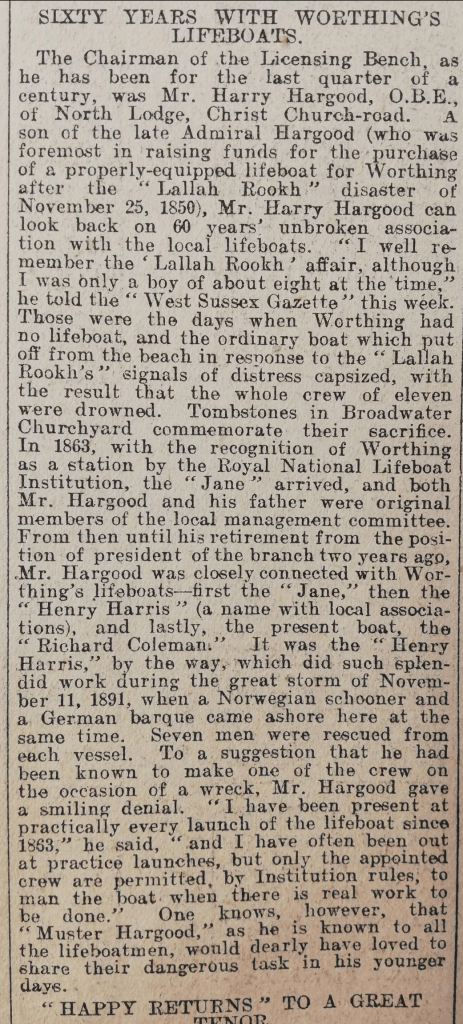 Article from the West Sussex Gazette, 12th March 1925, describing the legacy of Admiral Hargood, and his son Harry, who raised funds for a properly equipped and purpose-built lifeboat. Harry recalled the perilous rescue of the ‘Lallah Rookh’ in 1850. This was a desperately sad incident, where the lifeboat sent to assist it capsized drowning eleven crew members.