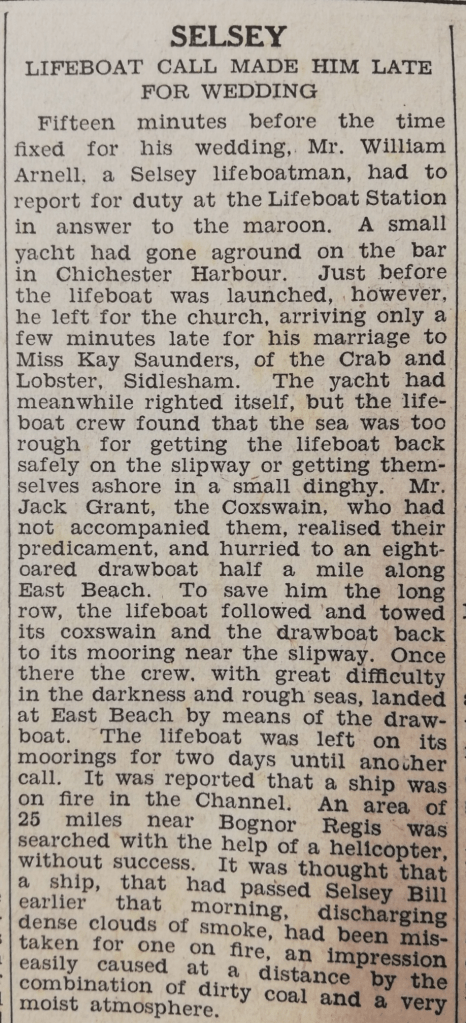 An amusing story from the West Sussex Gazette, 27th December 1956, recounting Selsey coxswain William Arnell’s wedding day. Just fifteen minutes prior to the service, William reported for duty when a small boat had become stuck in Chichester harbour. He did, fortunately for Kay, the bride, make it to the church just a few minutes late.
