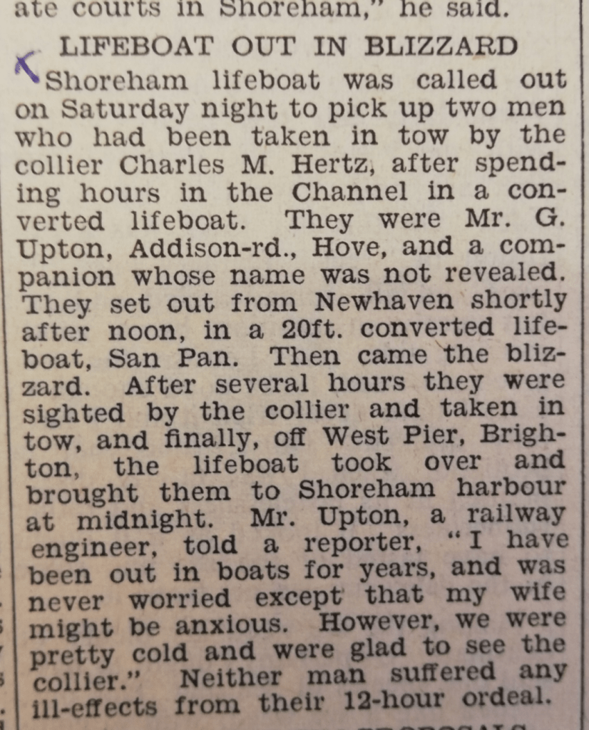 Another troubling story from the West Sussex Gazette, 13th March 1958. Shoreham’s lifeboat crew faced especially dangerous conditions when they saved the lives of two men in a blizzard. One man, a Mr Upton, normally unwavering when faced with the sea’s temper, admitted that on this occasion he was “glad to see the collier”.
