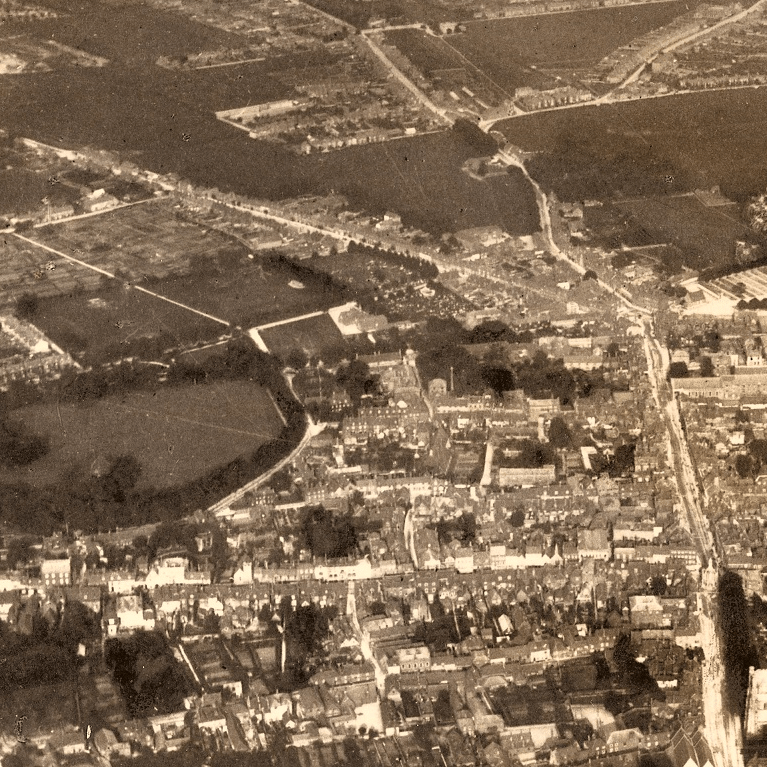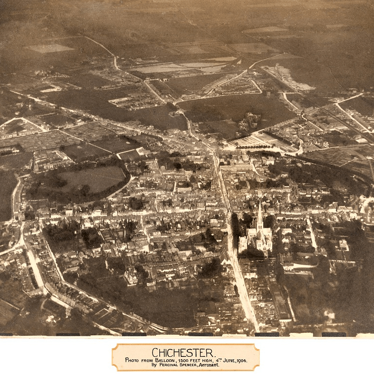 So, what did Chichester look like at the turn of the century? We could look at an OS map, or we could look at the first aerial photo of Chichester. APH 126 shows an aerial photograph of Chichester taken from a balloon by Percival Spencer, aeronaut on the 4th June 1904. It was taken from above West Street and looks towards Portfield and Whyke. It includes nearly all the city centre, but not the railway station (although you can spot the railway line to the east). Included with the photograph is a cutting from the Chichester Observer, 8th June 1904 describing the balloon flight. According to the article, the balloon was flown by Percival Spencer, accompanied by Mrs Manville, Mr F Butler, and Percival’s seven year old son, Charles, and had ascended at Crystal Palace and descended at Nursery Fields. Sounds like quite a trip!