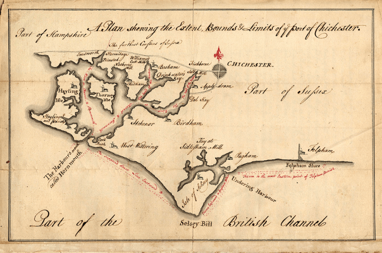 ChiCity AZ/2 aka ‘The Brown Book’ is a compilation of copies of different charters, statutes, leases and so on to provide a sort of overview of the rights and privileges of the Chichester Harbour and canal. We think it dates from the late 17th century. Included inside the front cover is this delightful map of Chichester and the surrounding coastline. The point of the map is to show the extent of the port of Chichester, so the city itself is relegated to being a circle. It only shows the four main streets leading over to Portsmouth/Southampton and south to Dell Quay (note the different spelling)!