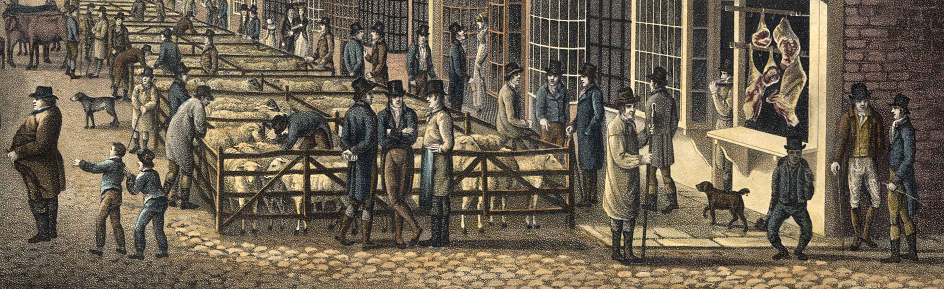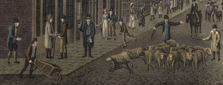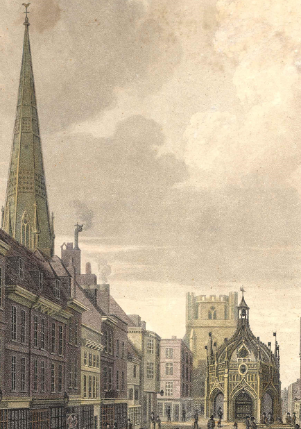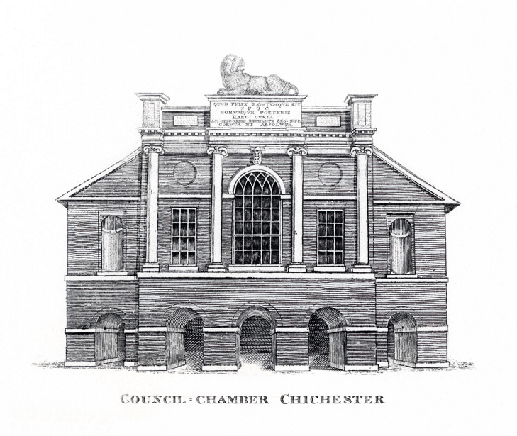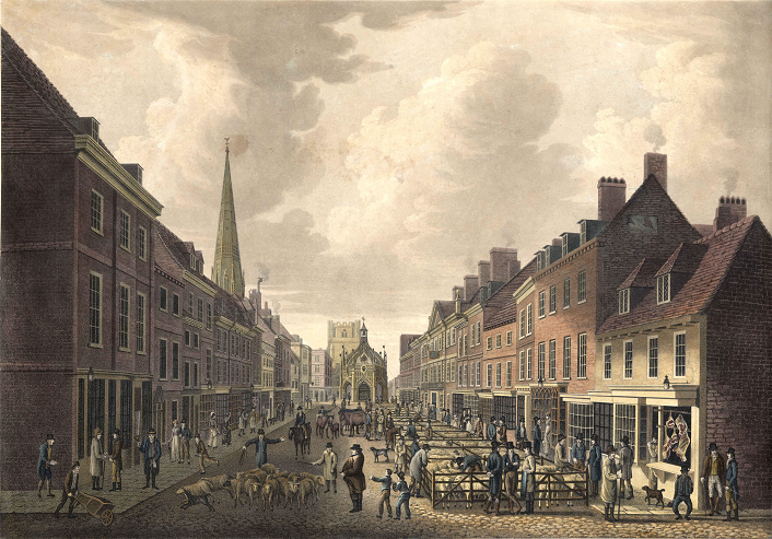 As for what Chichester actually looked like, an (idealised) painting by Joseph Francis Gilbert and later engraving by M Dubourg shows the East Street Market in 1814. The number of characters present in this painting could probably have an entire blog post dedicated to themselves, but it’s fascinating to see the interesting perspective used to show the breadth of East Street and the people going about their daily lives.
