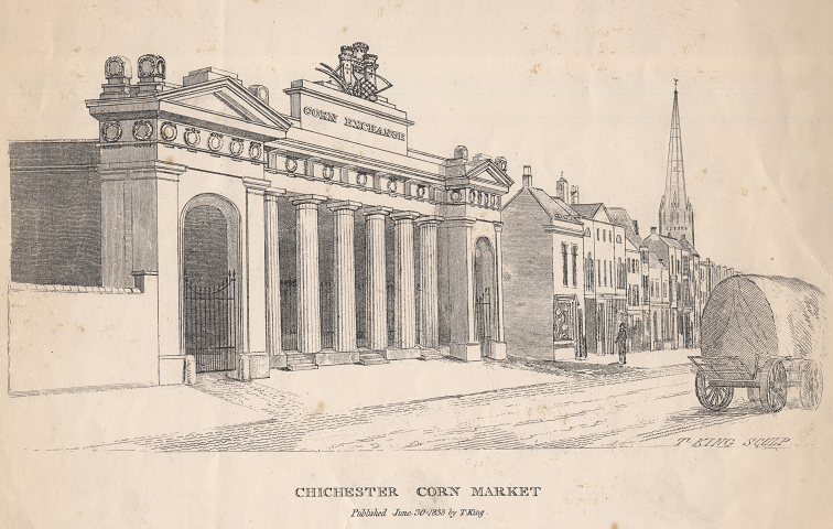Victorian Chichester saw a growth both in its population and economy, leading to the construction of some of the more interesting buildings in the city centre. For example, here we have PD 2807, which shows the Corn Exchange, in 1833. Built over a year between 1832 and 1833, the Chichester Corn Exchange was one of the first to be built in Britain.
