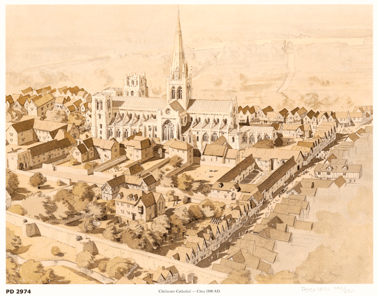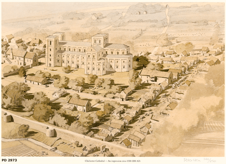 Alongside its city status, Chichester also was the centre of the Diocese. The Cathedral was consecrated in 1175, though it continued to be added to throughout the centuries, including the ill-fated spire which would later collapse in 1861 (which you can more about on another blog post here). The images below, painted by Peter Iden, show an impression of what medieval Chichester and its Cathedral could have looked like for the first 350 years.