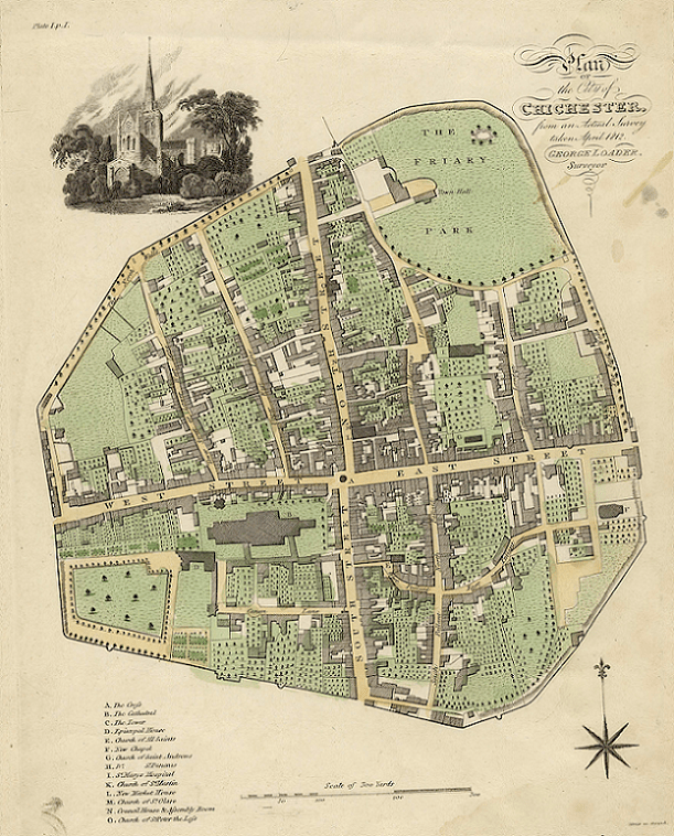 We can jump forward several decades to take a more detailed look of Chichester’s growth in PM 154, dated 1812 and made by G Loader. Important landmarks of Chichester are labelled in the key at the bottom, including the Cross; St Peter the Less, All Saint’s, St Andrew, St Martin, St Olave and St Pancras churches; St Mary’s Hospital, and – of course – the Cathedral.