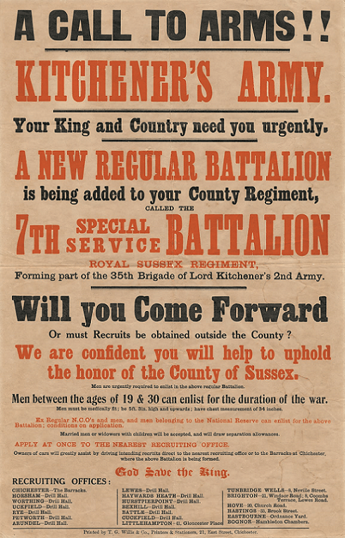 This poster to the left in particular was printed in Chichester itself, further emphasising the local connections to the regiment. During WWI, Kitchener’s army recruitment resulted in the 7th Battalion being formed (and indeed, many more Battalions to follow). RSR/MSS/7/5 deliberately draws on not only the reader’s loyalty to their country and monarch, but also to the County itself: