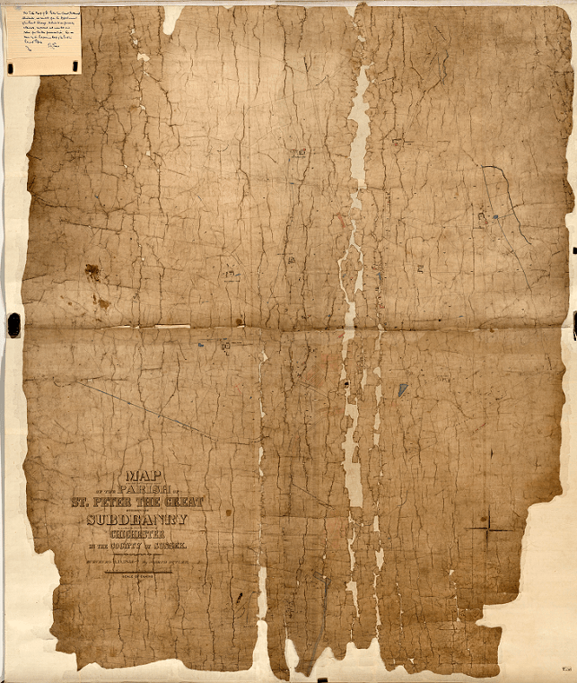 TD/W29 – Chichester, St Peter Great’s Tithe Map, 1846, has not gone through the years unscathed