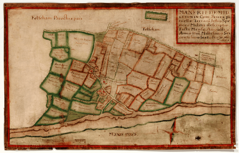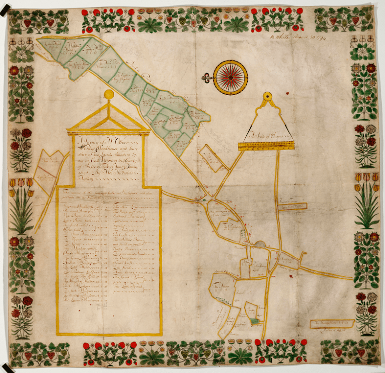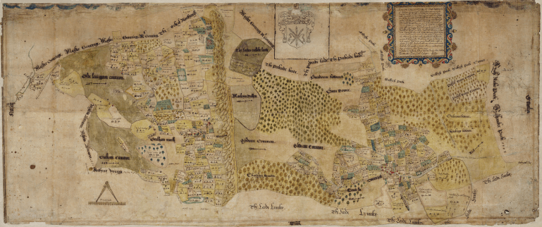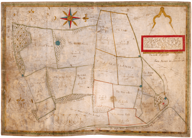 Whilst private estate maps overlapped with arrival of Tithe and OS maps in the 19th century, they far preceded either. Prior to the 16th Century, surveys of estates were largely done in written form. As with many parts of English history, the Dissolution of the Monasteries changed this. There was suddenly a lot of land up for grabs by the aristocracy that had once belonged to the church, and this helped facilitate the desire to map out what buildings, farms and tenants now fell under the new landowner’s domain.