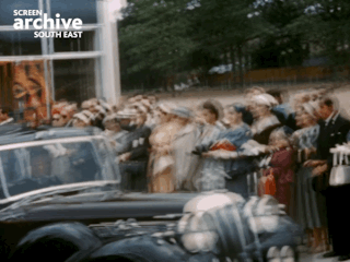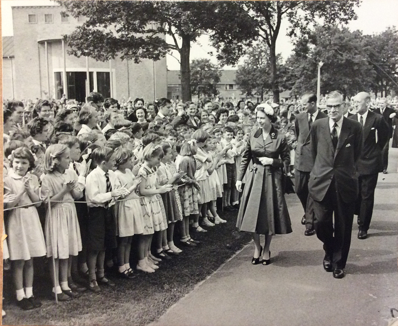 It is the Queen’s Square Shopping Centre that Elizabeth II visits in the accompanying film. However, a map recording the route of the royal visit shows that this was not the only stop on her itinerary. In a tour designed to showcase Crawley’s fantastic new amenities, the Queen and the Duke of Edinburgh also visited the Manor Royal industrial estate, Langley Hall Community Centre, and Three Bridges County Junior School amongst other sites. Along the way they were greeted by enthusiastic new Crawley residents – the age of the crowds reflecting the number of young families who had moved to Crawley and the resulting youthful demographic of the New Town.
