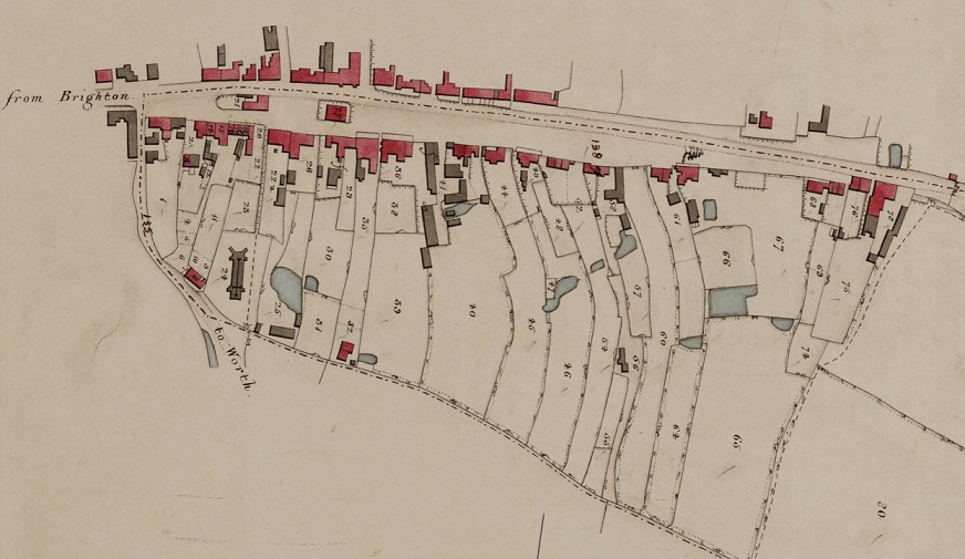 The 1839 tithe map for the northern division of the parish of Crawley shows a small town with buildings clustered along one main street with the most notable landmarks being Crawley Church and the George Inn, a local coaching inn. It is surrounded by fields and indeed the map for the southern division shows nothing but fields! The tithe maps for Ifield, Worth and Pound Hill tell a very similar story.