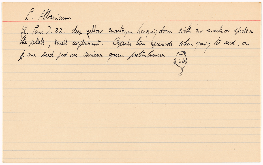 The archive includes important evidence of the Sterns’ work, their research, plant collecting, and their connections with botanists, plant hunters, scientists and the Royal Family. This is partly in the form of Stern’s plant index cards – detailed notes of different plant species, often with information about where they were found, the name of the plant hunter who found them, when Stern had planted seeds or cuttings, and the results. Some even include his sketches. There is also a series of glass plate negatives and photographs of many of the plants at Highdown, as well as people the Sterns had known and who had visited the house and gardens from 1918 to 1967.