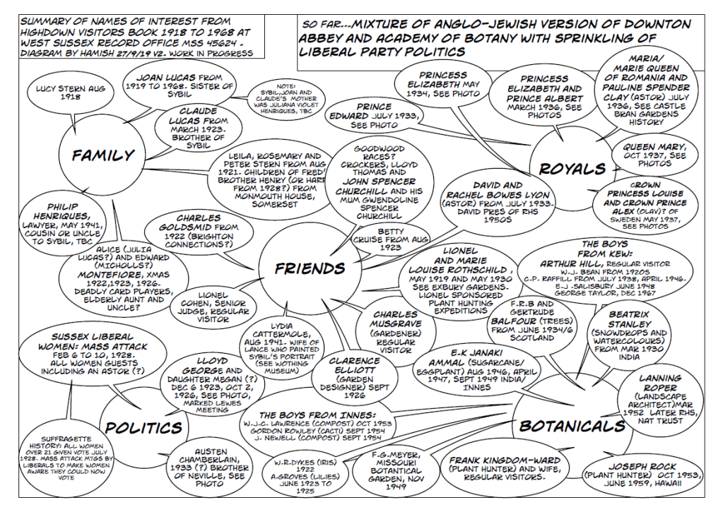 Then I discovered the Highdown Visitors Book at the WSRO. This is an amazing time machine with signatures, poems and even photos from 1918 to 1968. This shows the waves of visitors that game to Highdown including: Jewish aristocrats (Lionel Rothschild, Lucy Stern), plant hunters (Frank and Jean Kingdon-Ward), Royals (Prince Edward, Prince Albert and their mother Queen Mary), politicians (Lloyd George) and scientists (E.K. Janaki Ammal). Unlike other Visitors Books I have seen, the Sterns also pasted in photos of some of their VIP visitors. The image of a giggling Lloyd George and daughter Megan (WSRO Add Mss 45624) marooned near the Lime Kiln is my favourite. See my ‘bubble’ diagram of some of the visitor names.