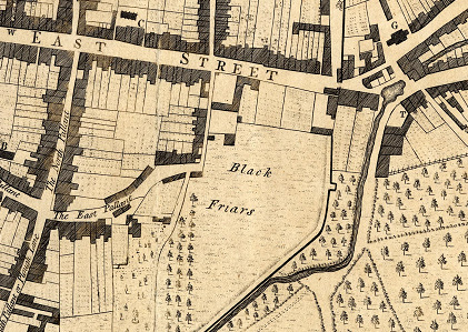 The Chichester that Charles would have known differs considerably from today. As you can see from the above map, the area to the East of Blackfriars consisted of open fields and wooded areas and would have given way to agricultural land outside of the city walls. If Charles was indeed a male domestic servant, he is likely to have been sent on errands on behalf of James and would have walked through streets bustling with markets, horses, carts and carriages. It is clear that whilst Charles spent several years living in Chichester, he did not die in the parish as no burial entry has been located.