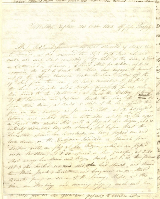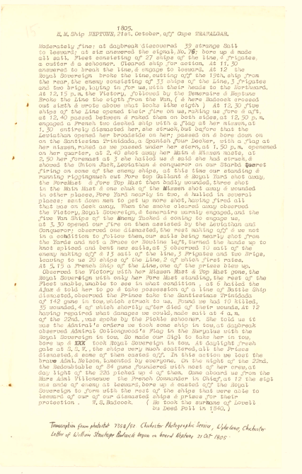 Add Mss 34047 – Transcript of letter written by Midshipman William Stanhope Badcock to his father, on board HMS Neptune, describing the Battle of Trafalgar, 1805