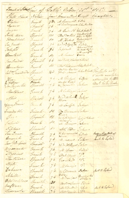 In these accounts we hear that Nelson split his fleet into two columns: Nelson leading from the Van or the front in the Victory and Admiral Collingwood leading the rear from the Royal Sovereign. Collingwood’s account in Buckle Mss 225 shows which ships of the fleet followed which admiral, including the Neptune’s position, in the line. What’s also interesting is that we have a list of ships in the French and Spanish fleet compiled by Badcock.