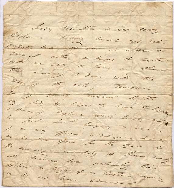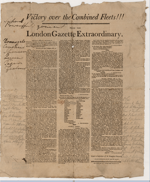 ‘Lady H hopes to have the happiness and honour of your company’ Lady Hamilton wrote some time after the Battle of the Nile, ‘for she Loves dearly all seamen, but particularly those spoken so highly of, by our brave Admiral [Nelson]’. This was an invitation to Captain George Murray to attend Horatio Nelson’s birthday party, showing how highly regarded the man was in his social circles. As beloved as Nelson was, the sentiments bestowed upon the events surrounding the Battle of Trafalgar were thus mixed: elation over a victory that meant Napoleon would never invade Britain, and grief upon hearing of the death of such a pivotal naval tactician and hero. Today’s blog shall introduce you to the documents held within the West Sussex Archives, relating first to the Battle of Trafalgar and Lord Horatio Nelson.