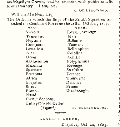With the absence of Captain Murray at Trafalgar, we have to look to other sources for what happened. So, for an account of the action we have the testimony of Midshipman William Stanhope Badcock (later Lovell) aboard HMS Neptune, and an account written to the Admiralty and published in the London Gazette Extraordinary by Admiral Cuthbert Collingwood, second in command, aboard the Royal Sovereign.