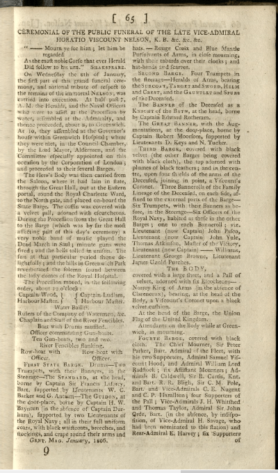 Both the Gentlemen’s Magazine (available in the Searchroom) and The Scots Magazine (accessed via the Newspaper collections on Find My Past) recorded every elaborate detail of Nelson’s arrival at Greenwich, his laying in state, the processions to the admiralty and St. Paul’s, and finally the service itself.