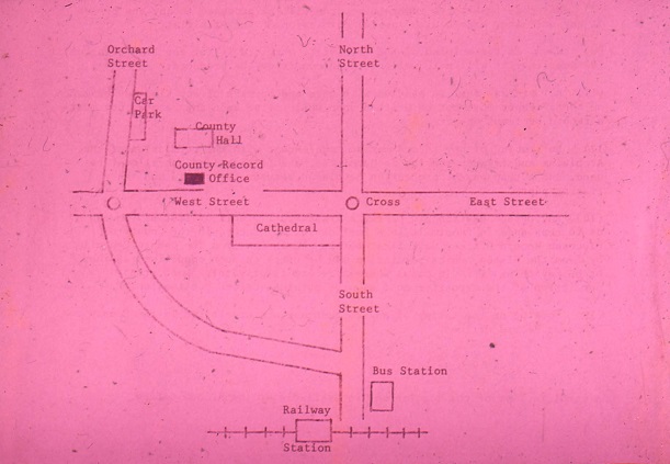 Plan showing the location of WSRO at Edes House and its proximity to County Hall and its current location on Orchard Street (not shown), opposite the car park, c1975 (WSRO: Slide 3)
