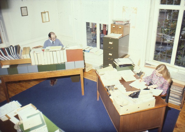 • Both working at large desks surrounded by index card drawers and papers, another member of staff is working at a large microfilm reader in the background