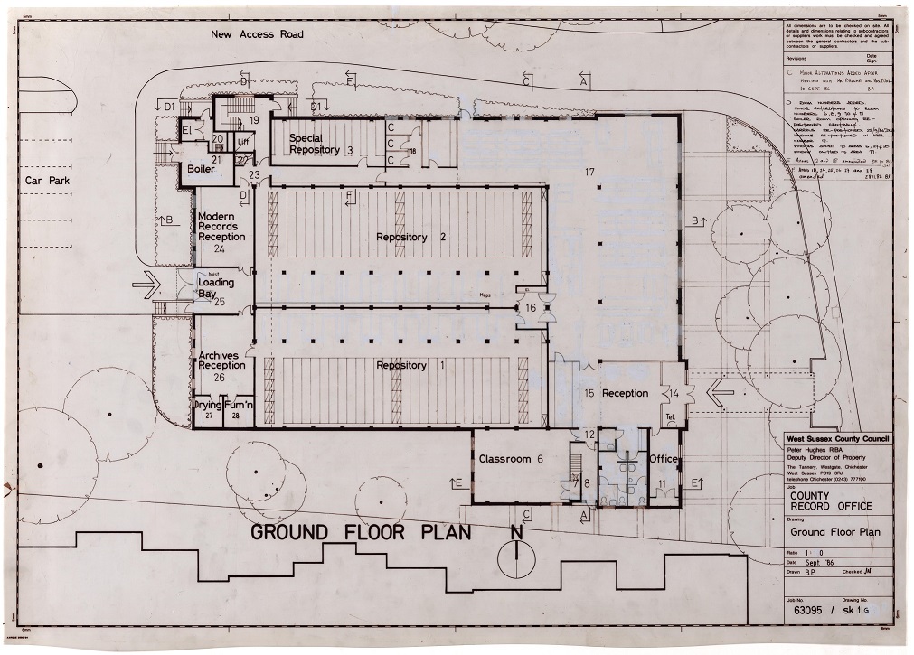 Established in 1946, WSRO’s first home was in the basement of County Hall, Chichester. Sadly, we have no images of the rooms or area it occupied, but an article published in Family Tree magazine (reference WSRO MP 8176) in 1985 described the accommodation as a ‘depressing environment’, surmising that: