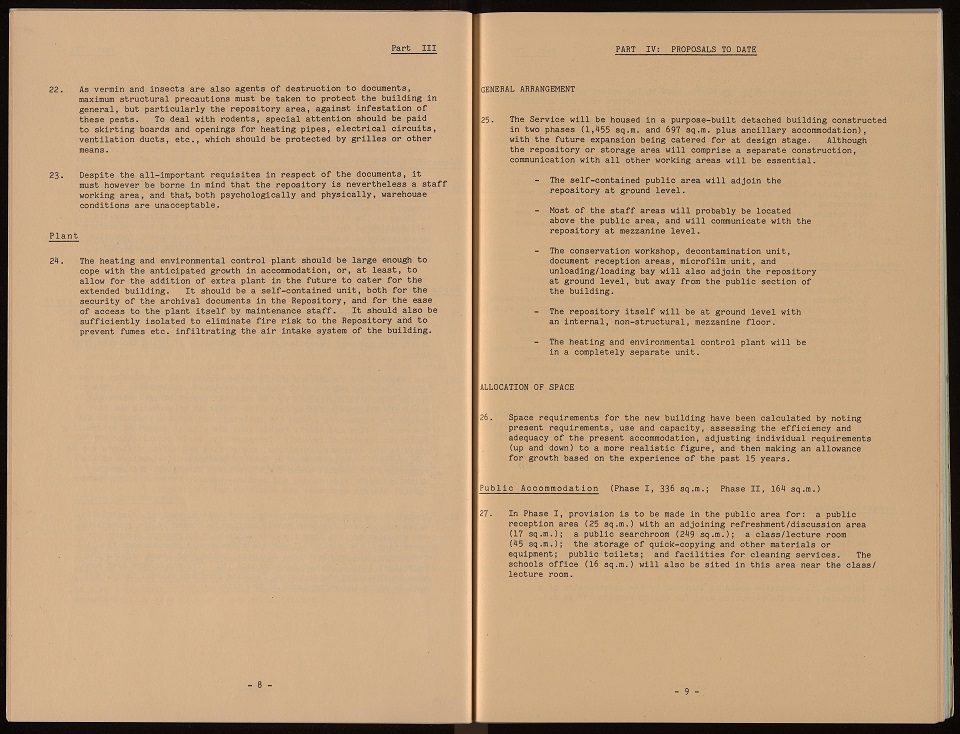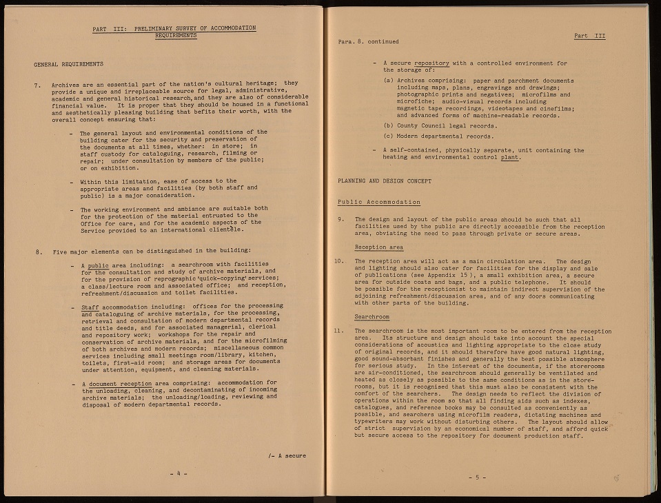 Excerpt from Mrs Gill’s 1984 Report on the West Sussex Record Office, written as part of the proposal to build a new, purpose built record office, focusing on ‘general requirements’ (WSRO: WDC/AV2/1)