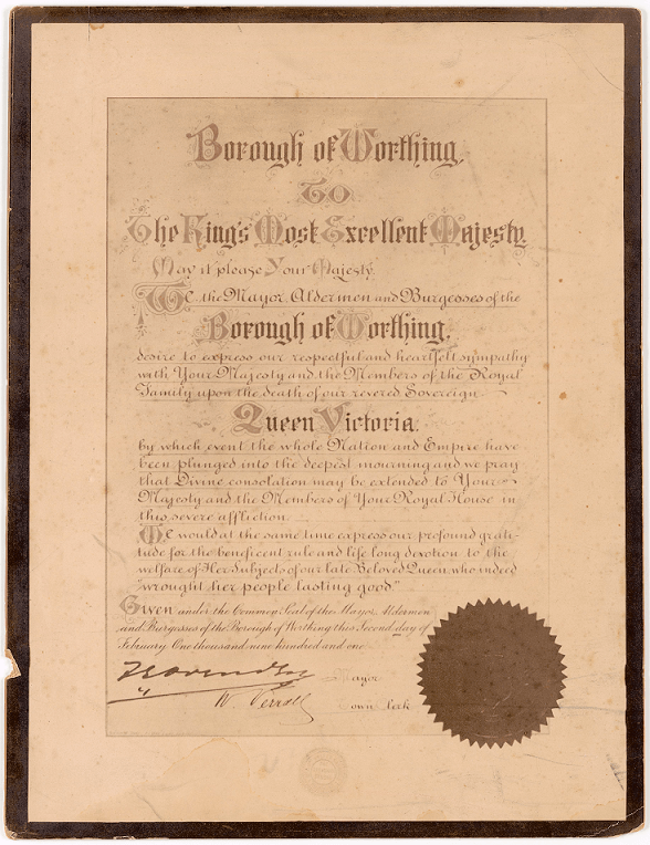 BO/WO/9/3 – Letter sent by Worthing “upon the death of our revered sovereign, Queen Victoria”, 1901