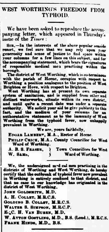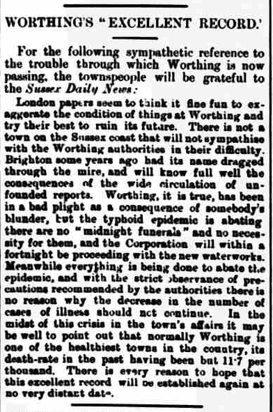 The authorities at Worthing are doing all in their power to prevent any recurrence of the disastrous outbreak of typhoid fever which so shattered the towns prospect and prosperity. During the past quarter no deaths have taken place from this appalling complaint, and only two cases of typhoid have occurred. The water supply is now as pure as that of any town in the Kingdom, and the danger has practically vanished. Although the fears of the public are not easily allayed, and the time may yet be far distant before Worthing regains her reputation as a health resort, the future of the town cannot but be fortunate.