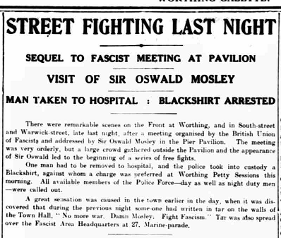 In 1933, the Borough managed to re-elect Charles Bentinck Budd after he announced he was not an Independent candidate, but rather a member of the British Union of Fascists (BUF). This fact did not go down well with both the Council and many Worthing residents. A series of fights – the so-called Battle of South Street – by the Pier ensued after the BUF held a rally in the town. The clash resulted in the BUF never returning to Worthing.