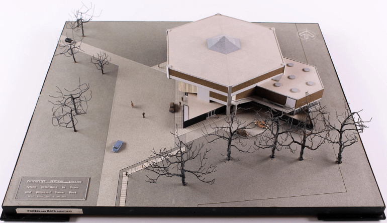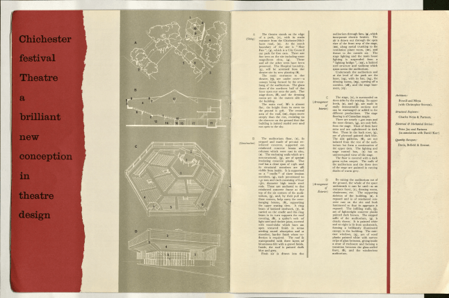The renowned architects Philip Powell and John Hidalgo Moya were behind the theatre’s unique shape. Together, they had previously worked on projects such as Churchill Gardens in Pimlico and on the iconic 1951 Festival of Britain Skylon structure on London’s South Bank. Evershed-Martin provided a simple brief, only requesting that the building must hold 1400 people, incorporate a thrust stage, and be as cheap as possible to build. As the theatre was only intended to be used during the summer months, the building’s facilities were kept to a minimum to save on costs.